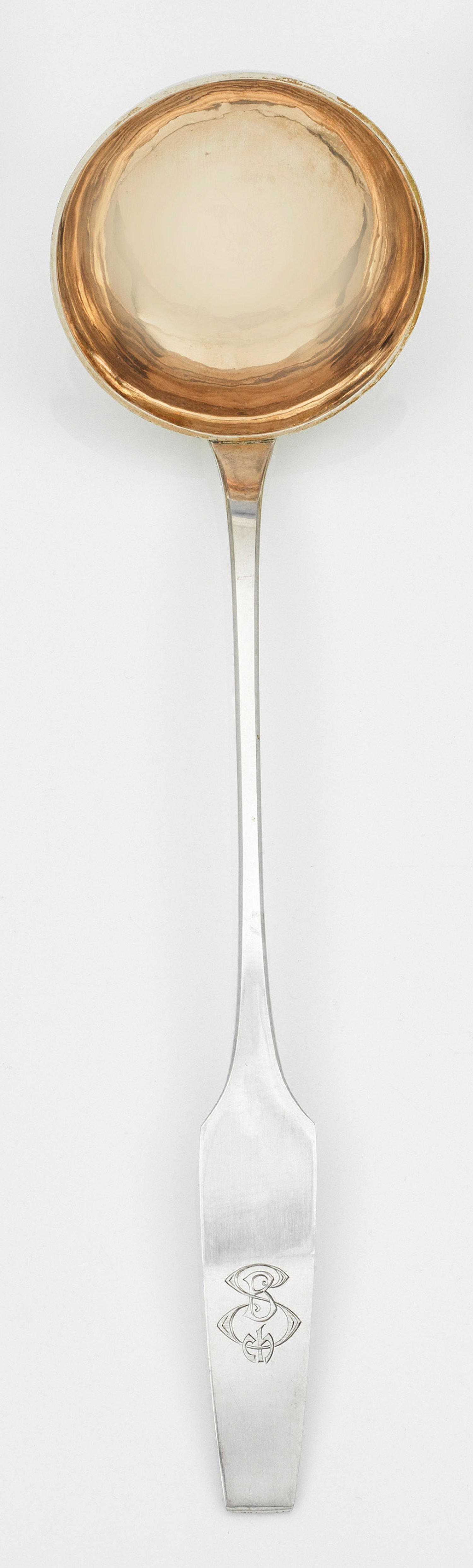 Silber. Runde, gemuldete Laffe, übergehend in schmalen, konischen Stiel und sich spatenförmig erweiterndes Heft. Darauf ein graviertes Monogramm "B Sch"(?). Innen vergoldet. Gest. 13 Lot, Beschauzeichen "W.", Meister wohl Johann Christian Karl Schwarze. Gew. ca. 135 g. L. 35 cm.