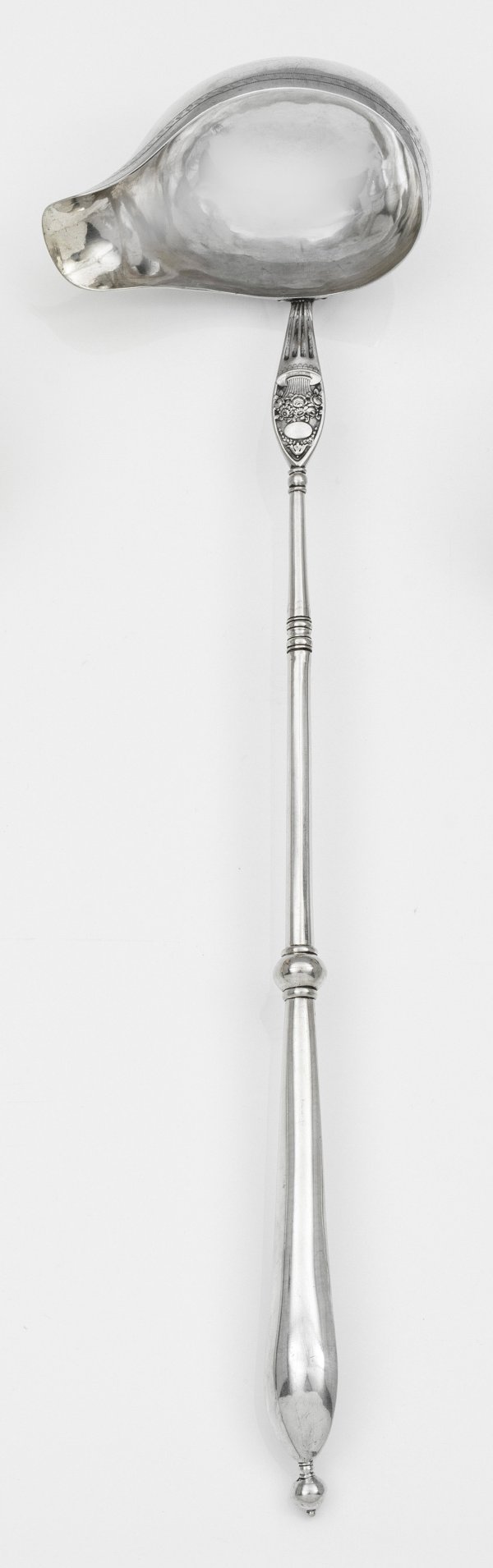 Silber. Bauchig ovale Laffe mit seitlichem Ausguss. Langer, schmaler, sich konisch erweiternder Stiel in Balusterknauf endend. Heftunterseite dat. "1855". Innen vergoldet. Gest., Beschauzeichen, Meister Johann Gottlob Christian Tormählen (wird Meister 1818). Gew. ca. 135 g. L. 41 cm.