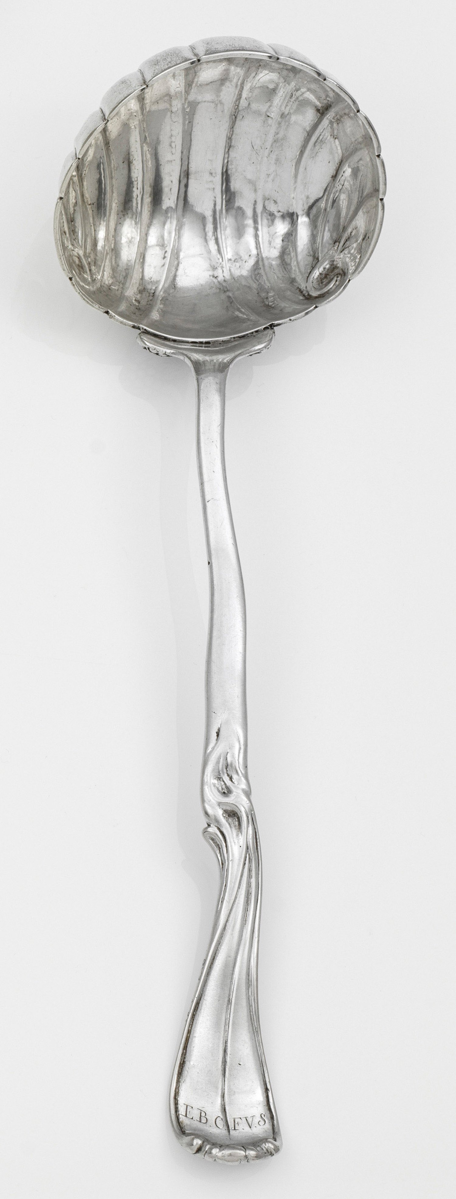 Silber. Tief gemuldete Laffe in Form einer Muschel. Stielansatz auf der Laffenunterseite mit reliefplastischem Weinlaub- und Traubendekor verziert. Sich konisch erweiternder, leicht geschwungener Stiel in vegetabil gestaltetem Heft mit gravierten Besitzermonogr. "E.B.C." und "F.V.S." endend. Gest., Beschauzeichen, Meister Friedrich August Zimmermann (wird Meister 1840), Jahresbuchstabe "S". Gew. ca. 270 g. L. 33,5 cm.