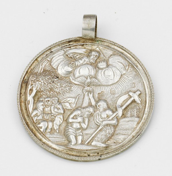 Silber. Runde Medaille mit breiter Öse und profiliertem Rand. Schauseitig fein ziselierte, reliefplastische Darstellung der Taufe Jesu. Rückseitig gravierte Widmung "Joseph Scheibel Geboren nachmittag um drey Viertl auf der drey Uhr den 20. April 1811. Vom Grosvatter Joseph Polhaker". Gest. 13 Lot, Beschauzeichen, Meister wohl Paul Mayerhofer (tätig ab ca. 1788), Steuerstempel (1810-1824). Gew. ca. 40 g. D. 6 cm.