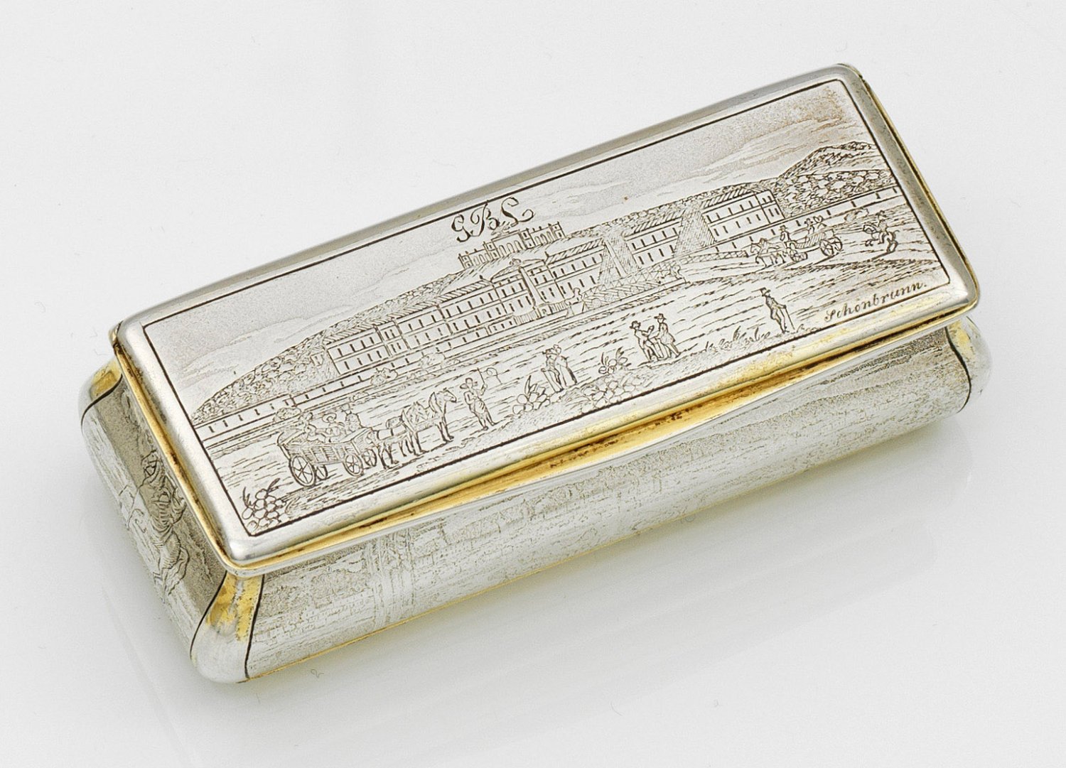 Silber. Schmaler, rechteckiger Korpus mit gering gebauchter Wandung und flachem, scharniertem Deckel. Allseitig äußerst zart und detailreich geätzte und gravierte sowie bez. Wiener Ansichten: Stadtansicht auf Wien vom Schloss Schönbrunn sowie von der Heiligenstadt, die Statue Kaiser Josephs II., die St. Stephans Kirche und das Burgtor. Auf dem Deckel oberhalb monogr. "GBL". Innen vergoldet. Gest. 13 Lot, Beschauzeichen, Meister Stephan Eduard Starkloff (wird Meister 1815). Gew. ca. 95 g. H. 2,4 cm. 8,7 cm x 3,2 cm.