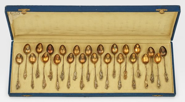 in originalen Bestecketuis. 37-tlg.; Silber, teilw. vergoldet. Ein Set mit zwölf Kaffeelöffeln und erg. Zuckerzange, monogr. "CC" sowie ein Set bestehend aus 24 Kaffeelöffeln mit verschiedenen vollplastischen Apostelfiguren als Griff. Teilw. gest., Beschaumarken, Herstellerzeichen u. a. von Josiah Williams, Jahresbuchstabe "R" sowie "G". Gew. zus. ca. 470 g.