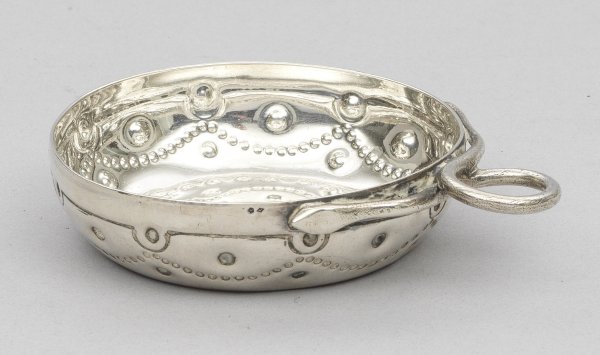 sog. Taste vin. Silber. Flache Schale mit gerundeter, glatter Wandung, reliefplastischem Punktedekor und plastischem Ringgriff in Gestalt einer Schlange. Am Rand mit Besitzergravur. Teilw. undeutlich gest., Pariser Feingehaltszeichen 1838 bis 1973. Gew. ca. 110 g. H. 2,5 cm. D. 9 cm.