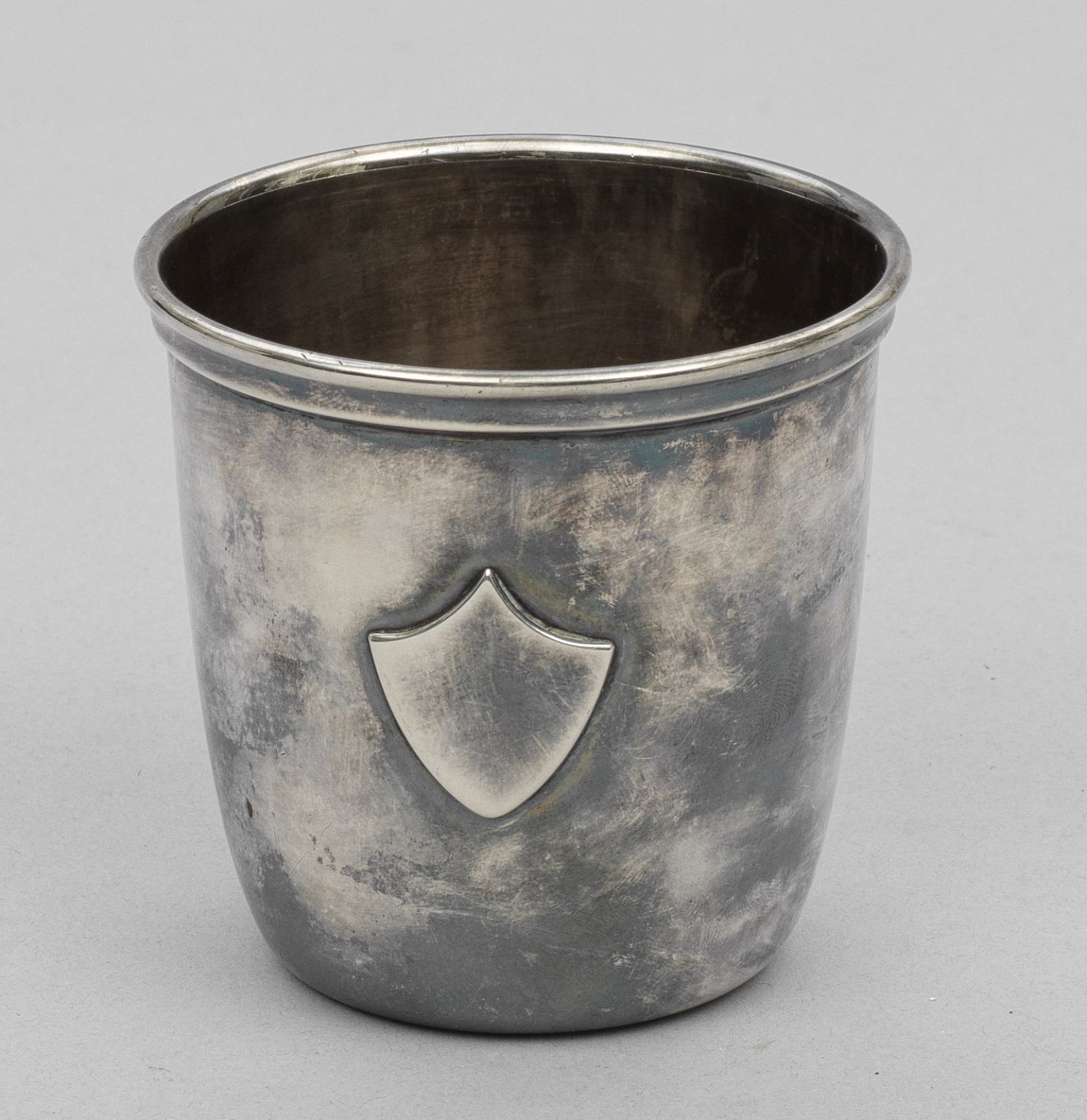 Sterlingsilber. Konische Form mit glatter Wandung und ausgestelltem Lippenrand. Schauseitige Wappenkartusche. Innen vergoldet. Gest. "Sterling", Herstellerzeichen. Gew. ca. 110 g. H. 7,3 cm.