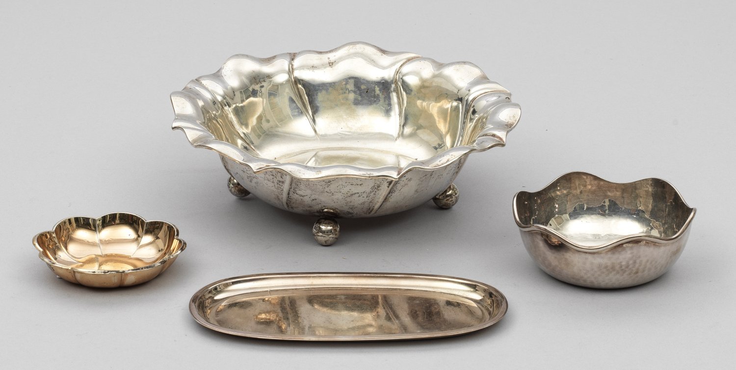 Silber. Passig geschweifte Schalen unterschiedlicher Größe und länglich ovales Tablett. Teilw. innen vergoldet. Gest. 800, 835, 925, verschiedene Herstellerzeichen. Gew. zus. ca. 760 g. Schalen-D. 11 cm - 27 cm. Tablett: 22 cm x 11,5 cm.
