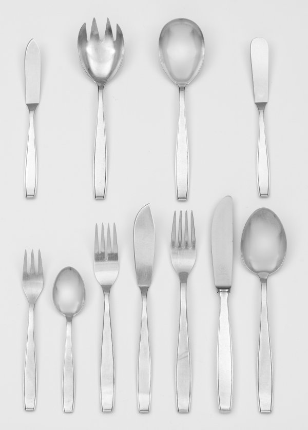 Silber. 85-tlg.; 12 Tafelmesser, 12 -gabeln, 11 -löffel, 12 Fischmesser und 12 -gabeln, 10 Kuchengabeln, 12 Teelöffel, 4 Vorlegeteile u. a. Salatbesteck. Sich konisch erweiternder Griff mit profiliertem Rand. Schneiden aus Edelstahl. Gest. 800, Herstellerzeichen. Gew. zus. ca. 4015 g (Gew. ohne gefüllte Teile ca. 3390 g).