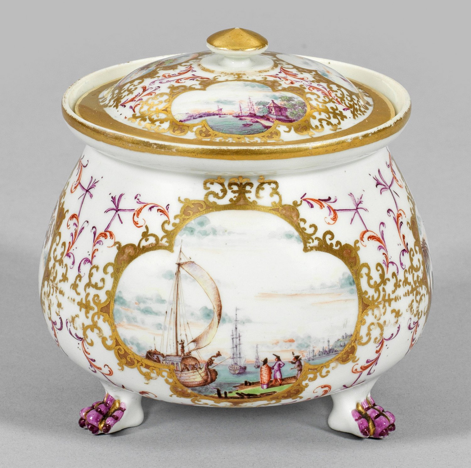 Böttgerporzellan. Runder, gebauchter Korpus auf drei purpurfarben staffierten Tatzenfüßen mit seitlichem, breitem Volutenhenkel. Aufgewölbter Deckel mit Scheibenknauf. Auf der Wandung und dem Deckel, vierpassige Goldornamentreserven mit Lüsterfond, umzogen von purpurfarbenem und eisenrotem Laubwerk. Darin verschiedene Hafenszenen mit Kaufleuten und Handelsschiffen und ferne, architekturbestandene Uferlandschaften mit Figurenstaffage bzw. weitläufige exotische, teilw. palmenbestandene Flusslandschaften mit Asiaten und dunkelhäutigem Mann im Gespräch vor baumbestandener Kulisse mit Kamelführern. Äußerst feine, polychrome Malerei, wohl von Christian Friedrich Herold oder Johann Georg Heintze. Reiche Goldstaffage. Boden und Deckel mit Gold-Nr. 6. Minim. rest.; H. 10,5 cm.