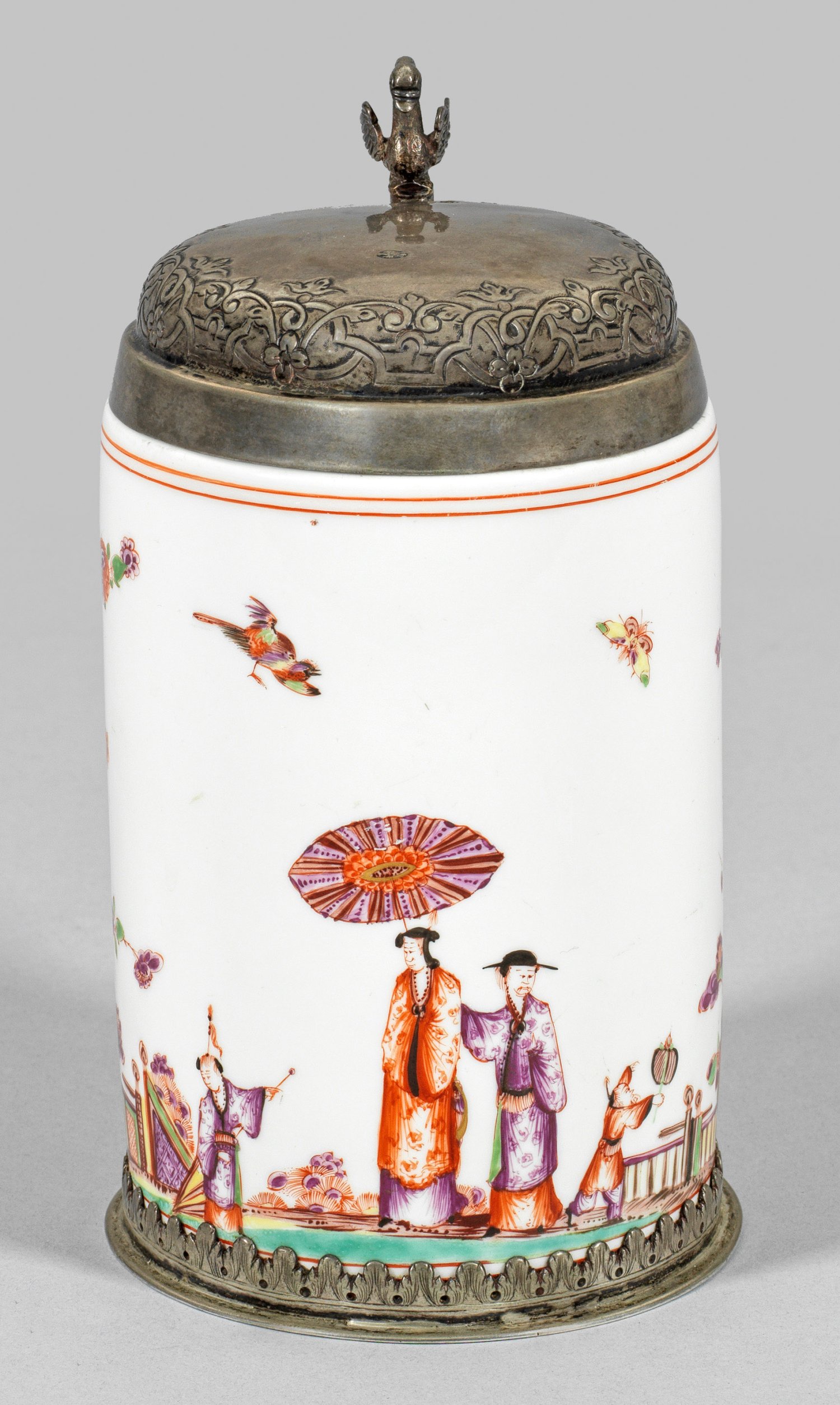 Zylindrischer Korpus, rückseitig gerundeter Bandhenkel mit Palmettenrelief. Auf der Wandung szenische Darstellung von festlich gekleideten Chinesen mit Fächern und geöffnetem Schirm in blühender, asiatischer Gartenlandschaft mit emporwachsenden Päonien- und Chrysanthemenbäumen. Polychrome Malerei in Eisenrot, Purpur, Moos- und Seegrün, Braun und Schwarz, wohl von Johann Ehrenfried Stadler. Silbermontierter Stand und Deckel mit ziselierter Bandelwerkbordüre, Daumenrast in Vogelform. Gest., Beschauzeichen Frankfurt/Main, Meister Johann Conrad Kempf (Kämpf) (wird Meister 1715). H. 19 cm.