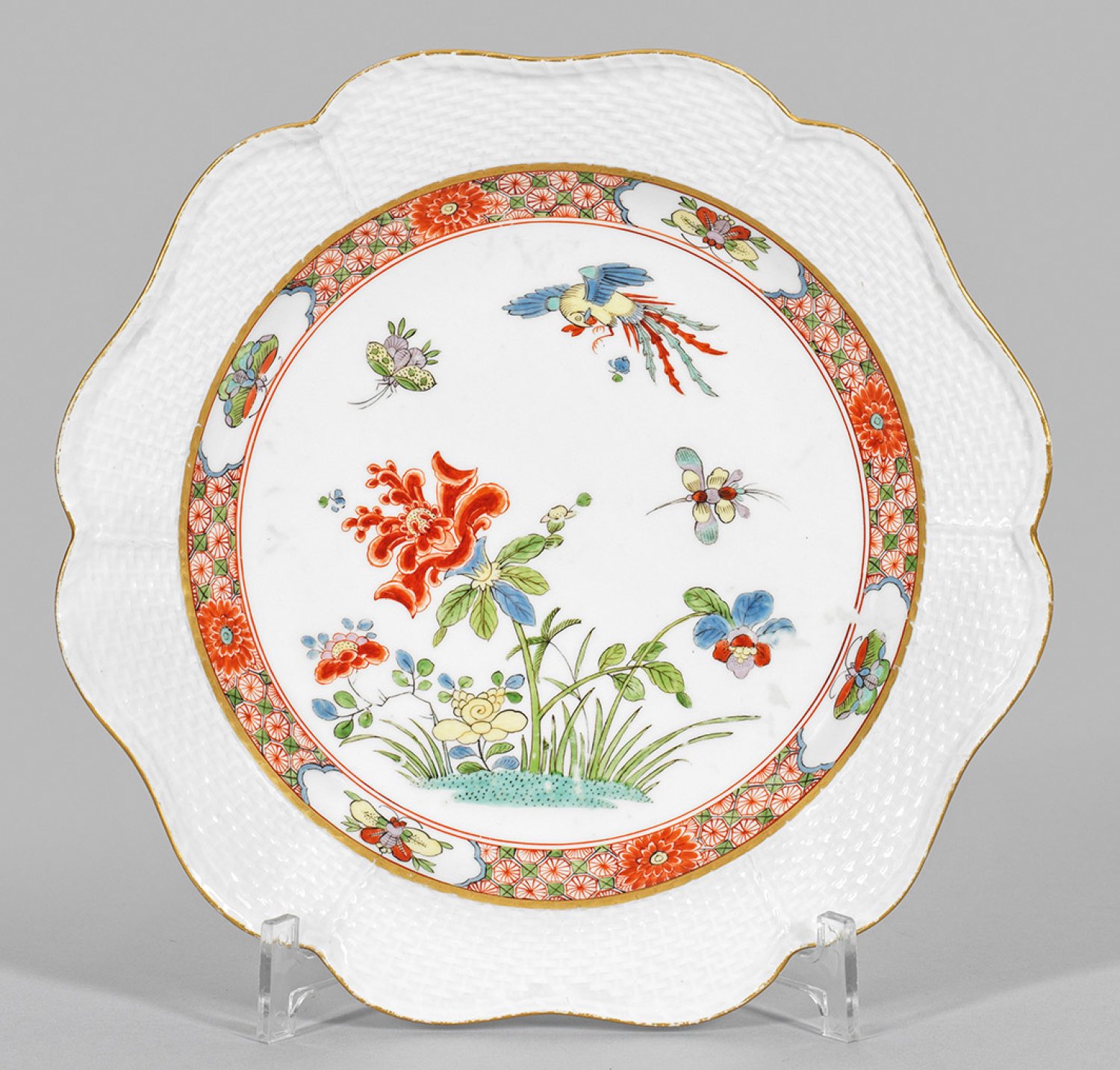Runde Form mit geschweiftem Goldrand. "Altozier"-Reliefdekor. Im leicht vertieften Spiegel leuchtend farbiger Dekor im Stil der chinesischen "Famille verte"-Porzellane aus stilisiertem Lotusgewässer mit Blüten, umgeben von blühenden Päonienzweigen, fliegendem Hôô-Vogel (Phönix), Schmetterlingen und Streublumen, gerahmt von breiter Brokatbordüre mit großen Chrysanthemenblüten und farbenprächtigen, in vier passigen Reserven gerahmten Schmetterlingen. Polychrome Malerei im Kakiemonstil in Emailblau, Eisenrot, See- und Moosgrün sowie Gelb und wenig Aubergine. Unw. ber.; Schwertermarke. D. 25 cm.