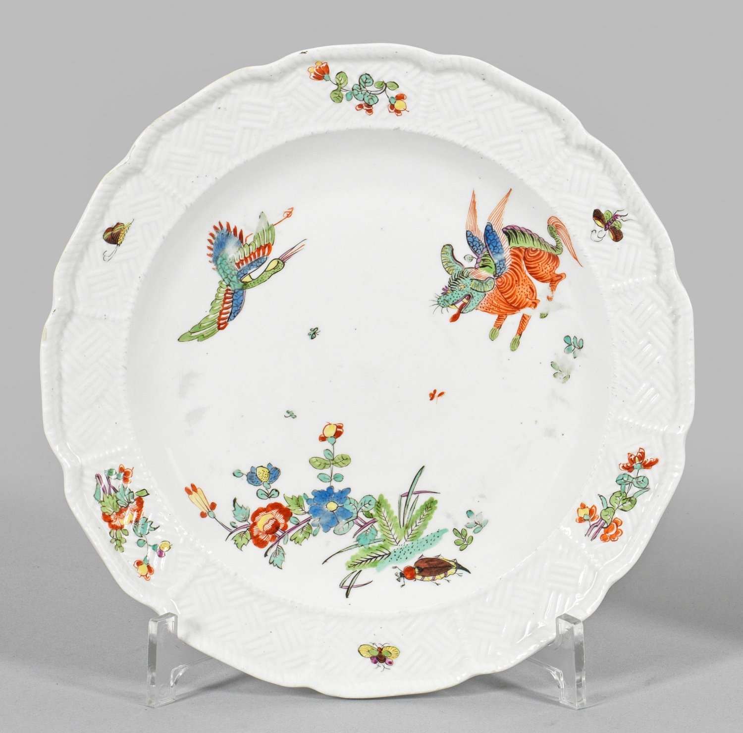 Runde Form mit fassoniertem Rand. Reliefdekor "Sulkowski". Im leicht vertieften Spiegel sog. "Koreanischer Löwe" unweit eines fliegenden Reihers, umgeben von Päonienzweigen, Gräsern und Farnen sowie Maikäfer, auf der Fahne Blütenzweige und Schmetterlinge. Polychrome Malerei im Kakiemonstil in Eisenrot, Emailblau, See- und Moosgrün, Braun, Gelb und Purpur. Dreherzeichen für Johann Martin Kittel. Unw. ber.; Schwertermarke. D. 22,5 cm.