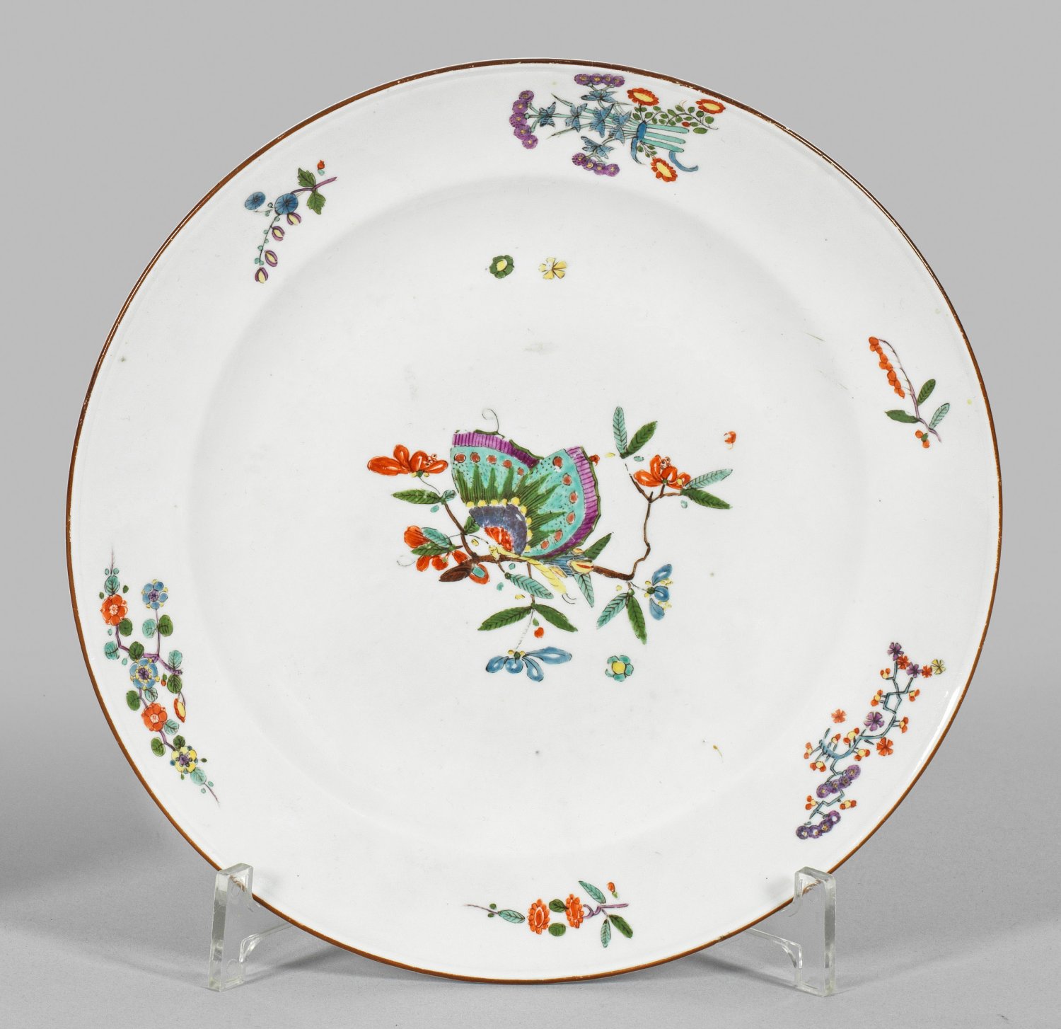 Runde Form mit glattem, braunem Rand. Im leicht vertieften Spiegel auf einem Ast sitzender Schmetterling. Auf der Fahne gestreute Blütenzweige. Polychrome Kakiemonmalerei in Moos- und Seegrün, Emailblau, Purpur, Gelb und Braun. Dreherzeichen für Johann Martin Kittel. Schwertermarke. D. 23,5 cm.