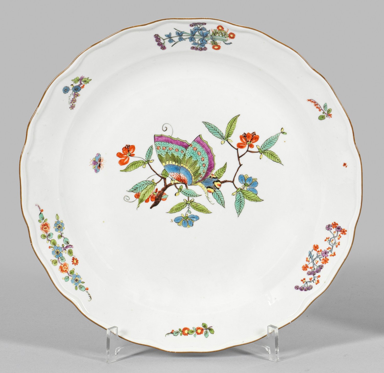 Runde Form mit passig geschweiftem, kapuzinerbraunem Rand. Im vertieften Spiegel auf einem Ast sitzender Schmetterling, auf der Fahne gestreute Blütenzweige. Polychrome Kakiemonmalerei in Moos- und Seegrün, Emailblau, Purpur, Gelb und Braun. Press-Nr. 20. Ber.; Schwertermarke. D. 30 cm.