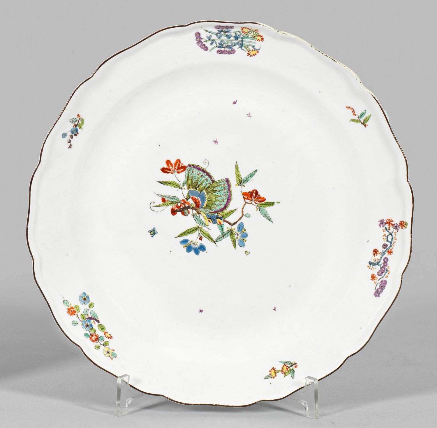 Runde Form mit passig geschweiftem, dunkelbraunem Rand. Im leicht vertieften Spiegel auf einem Ast sitzender Schmetterling, auf der Fahne gestreute Blütenzweige. Polychrome Kakiemonmalerei in Moos- und Seegrün, Emailblau, Purpur, Gelb und Braun. Dreherzeichen für Johann Christoph Fleischer (seit 1731 als Weißdreher tätig). Standring best.; Ber.; Schwertermarke. D. 30 cm.