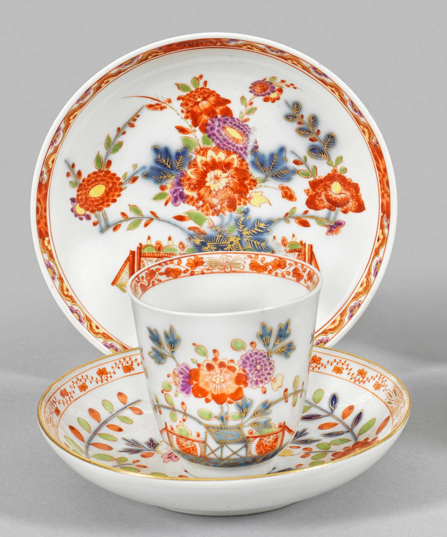 und Untertasse. Unterglasurblaue Malerei, polychrom überdekoriert mit blühenden Päonien und Chrysanthemen. Umlaufende florale Ornamentbordüre. Untertasse mit Dreherzeichen. Beigabe: Im Dekor korrespondierende, weitere Untertasse, um 1900. Schwertermarke. H. 7 cm.
