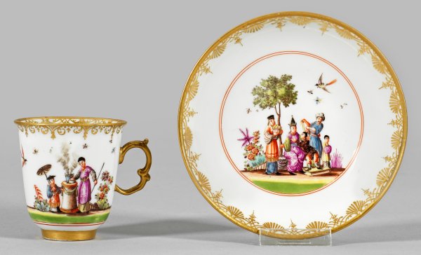 auf Unterschale. Konisch ansteigender, becherförmiger Korpus mit leicht ausgestelltem Rand. Seitlich vergoldeter Henkel aus gegenläufigen Voluten. Umlaufend der Wandung und im Spiegelmedaillon szenische Darstellung von Chinesen in blühender Gartenlandschaft bei der Speisenzubereitung bzw. vor belaubtem Baum sitzende, hochgestellte Persönlichkeit in Beisein von Kindern und Diener. Feine, polychrome, goldgehöhte Malerei. Umlaufende Goldspitzen- und Fächerbordüren. Jeweils Stern mit Punktkreis als Vergolderzeichen. Schwertermarke. H. 7 cm.