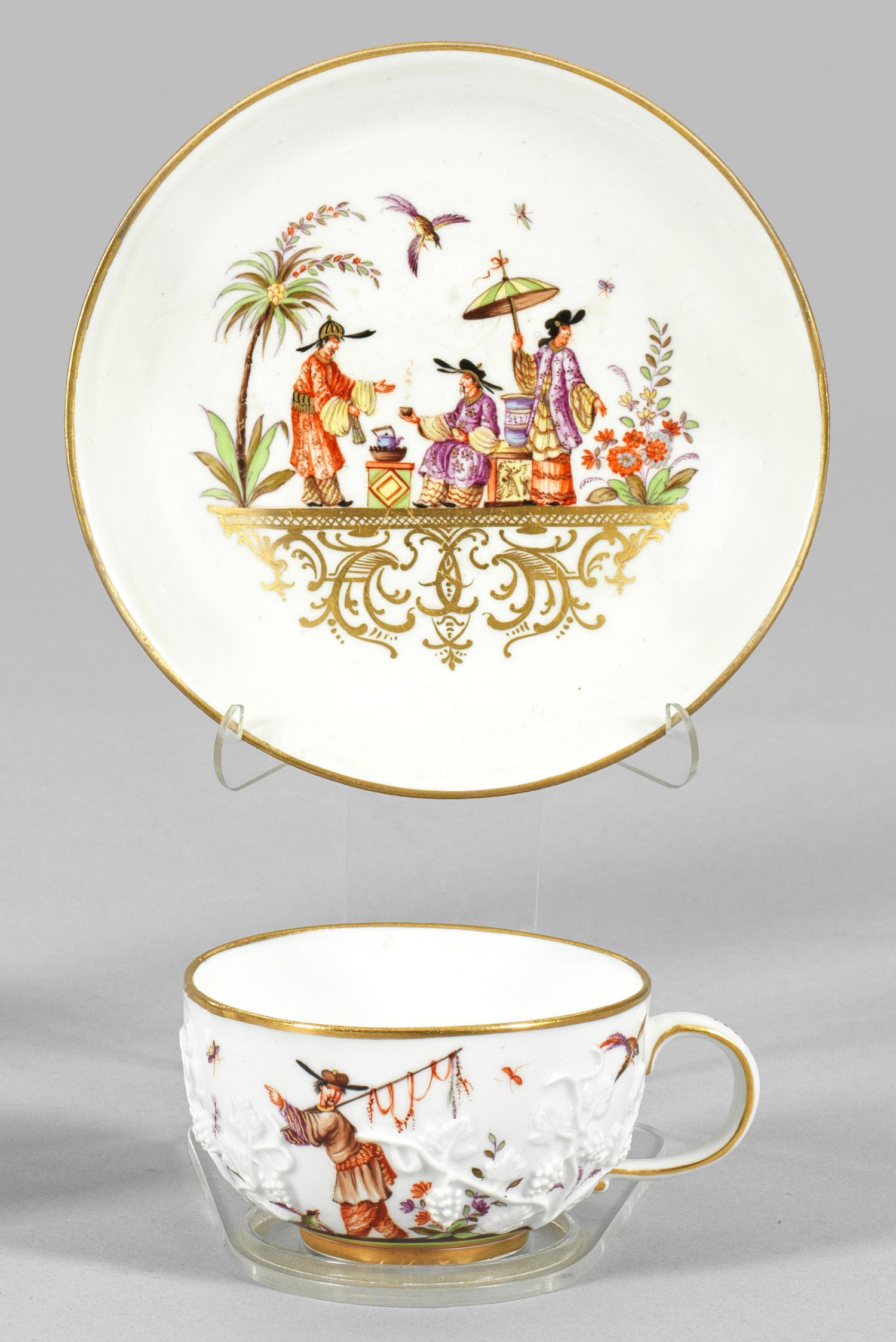 auf Unterschale. Halbkugelige Form mit Ohrenhenkel. Auf den Wandungen reliefplastisch aufgelegter Weinrebendekor. In den Zwischenräumen sowie im Spiegel Darstellungen in der Art der Hoeroldt-Chinoiserien. Festlich gekleidete Chinesen in blühenden, asiatischen Gartenlandschaften auf Terrain- bzw. Goldornamentkonsolen. Polychrome, goldgehöhte Malerei. Goldstaffage. Minim. best.; Teilw. rest.; Schwertermarke. H. 5 cm. Unterschalen-D. 13,5 cm.