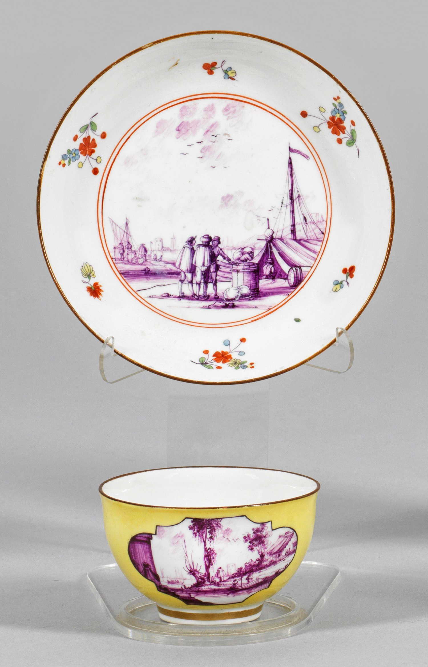 A yellow ground porcelain tea bowl on saucer with river landscapes and "Kauffahrtei" scene in purple camaieu. Former's marks. Tea bowl minor restored. Crossed swords mark.