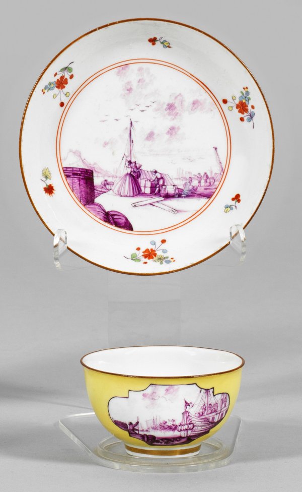 A yellow ground porcelain tea bowl on saucer with "Kauffahrtei" scenes in purple camaieu. Former's marks. Tea bowl insignificantly restored. Crossed swords mark.