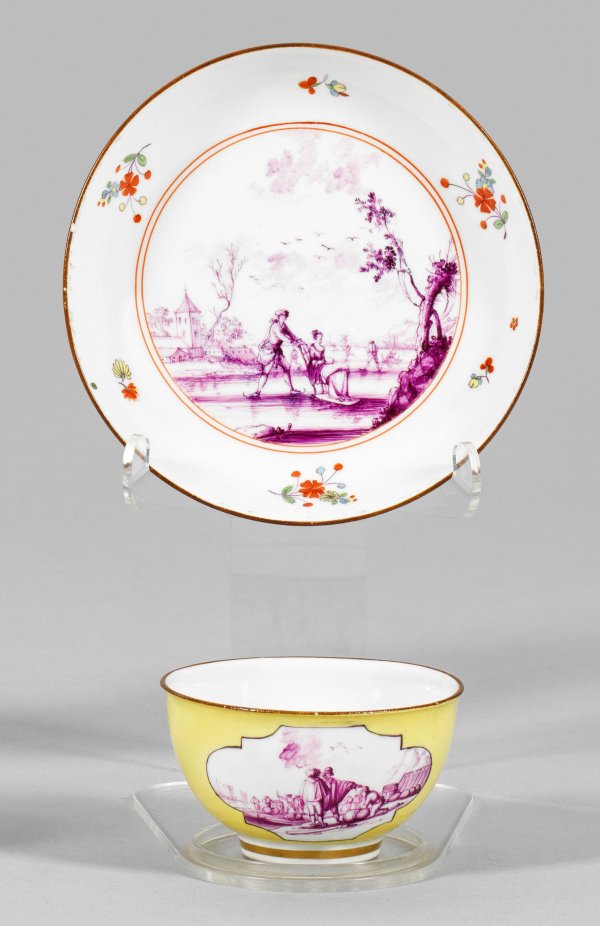A yellow ground porcelain tea bowl on saucer with "Kauffahrtei" scene and landscape in purple camaieu. Former's marks. Minor chipped. Crossed swords mark.