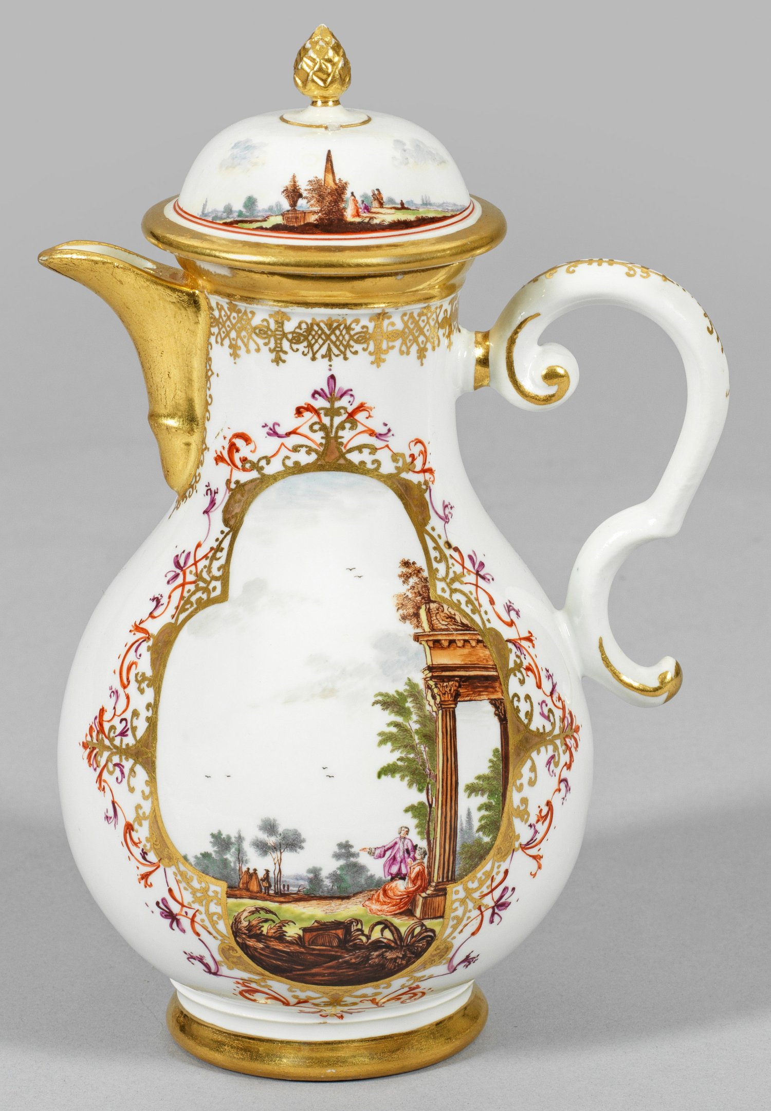Birnförmiger Korpus mit Volutenhenkel und Schnabelausguss. Aufgewölbter Deckel mit Pinienknauf. Beidseitig der Wandung vierpassige, von purpurfarbenem und eisenrotem Laubwerk umzogene Goldornamentreserven mit Lüsterfond. Darin szenische Darstellung von höfischen Watteaufiguren in weiter Landschaft mit imposanter Architektur. Der Deckel mit umlaufender Szenerie. Äußerst feine polychrome Malerei, wohl von Johann Georg Heintze. Reicher Golddekor. Teilvergoldung. Undeutl. Dreherzeichen, wohl Johann Martin Kittel Gold-Nr. 60. Schwertermarke. H. 22 cm.