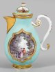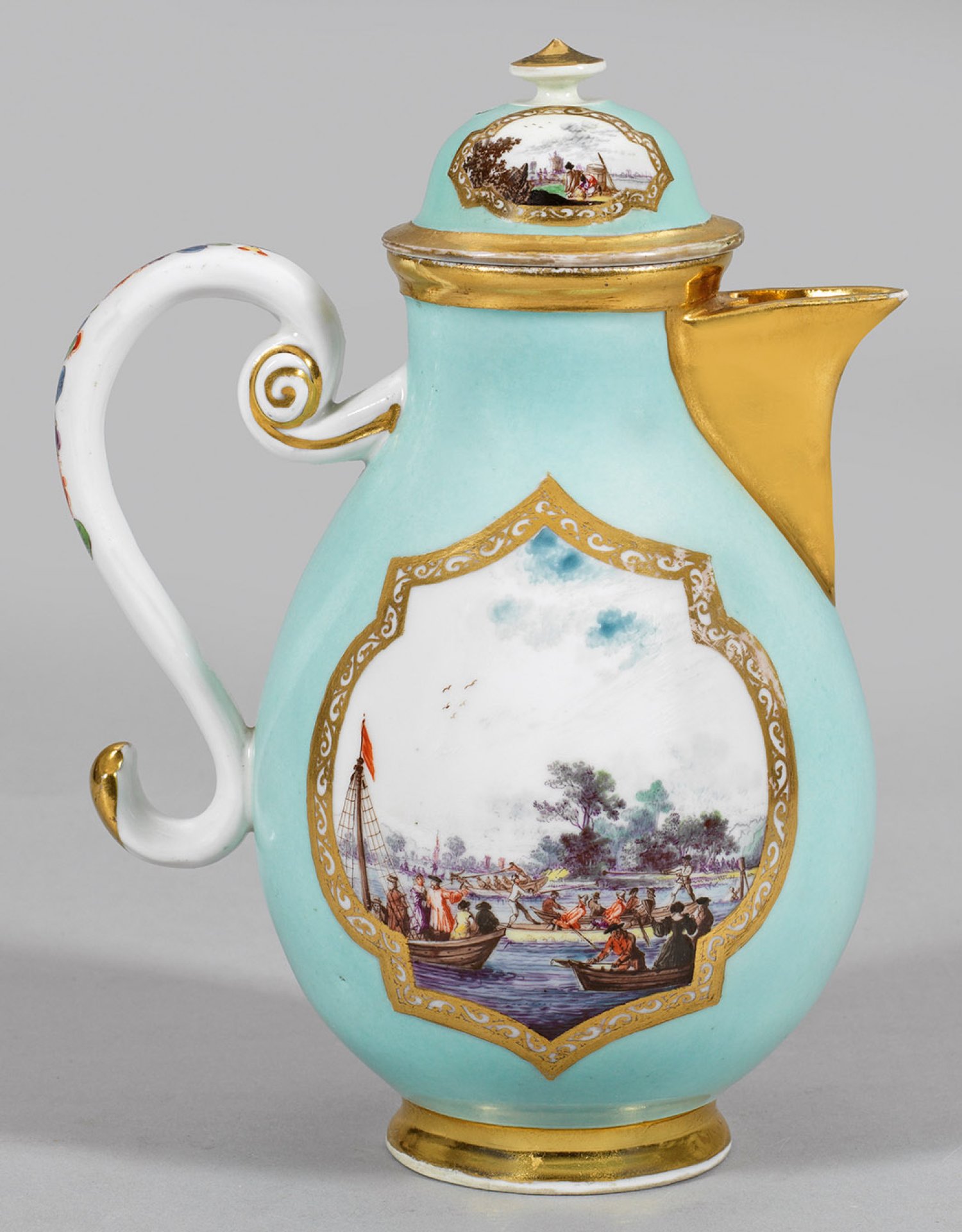 Birnförmiger Korpus mit Volutenhenkel und konsolförmigem Schnabelausguss. Aufgewölbter Deckel mit Scheibenknauf. Beidseitig der Wandung, in seegrünem Fond ausgesparte, goldgerahmte Vierpassreserve mit Watteau- bzw. Kauffahrteiszene. Schauseitig, nahe eines Brunnens mit Wasserspiel dargestelltes, lustwandelndes Pärchen in baumbestandener Parklandschaft. Im Hintergrund sitzender, musizierender Lautenspieler und zwei Figuren. Rückseitig zahlreiche, mit Damen und Herren besetzte Ruderboote auf vielbefahrenem Gewässer vor architektur- und baumbestandener Uferkulisse. Äußerst feine, polychrome Malerei, wohl von Johann Georg Heintze. Golddekor. Vergoldeter Ausguss und Stand. Henkel mit feinem Indianischem Blütendekor. Dreherzeichen für Christian Meinert (Meynert) (1711-1746; tätig ab 1733). Deckel rest.; Schwertermarke. H. 20,5 cm.