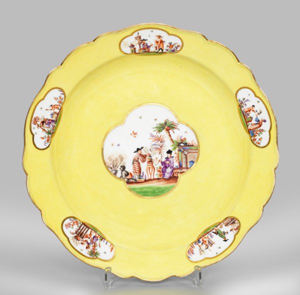 Runde Form mit passig geschweiftem Rand. Im vertieften Spiegel und auf der Fahne, in farbkräftigem, gelben Fond vierpassig ausgesparte, goldkonturierte Reserven mit sog. Chinoiserien in der Art von J. G. Hoeroldt. Festlich gekleidete Chinesen in blühenden, teilw. palmenbestandenen Gartenlandschaften. Im Spiegel zwei Herren bei der Teezeremonie unweit