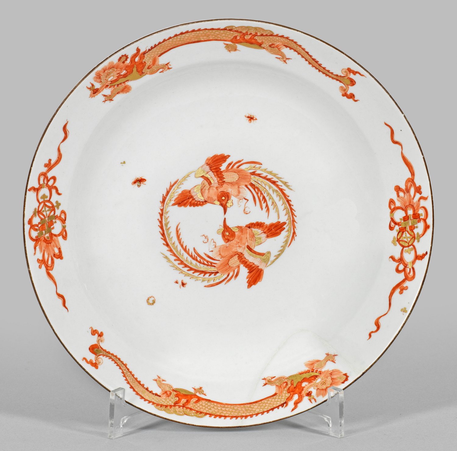 Runde Form mit braunen, glatten Rand. Im vertieften Spiegel zwei kreisförmig angeordnete Phönixe, auf der Fahne langgestreckte chinesische Drachen im Wechsel mit buddhistischen Symbolen der sog. "Acht Kostbarkeiten". Eisenrote, in Gold gehöhte Camaieumalerei. Rest.; Schwertermarke. D. 26 cm.