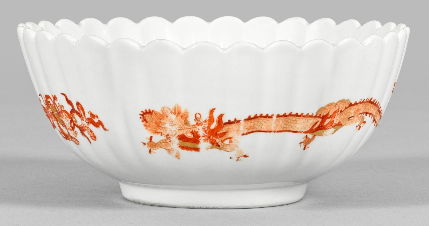 Runde, gemuldete, fächerartig gerippte Form auf rundem Standring. Dekor aus zwei kreisförmig angeordneten Phönixen sowie langgestreckter, chinesischer Drache im Wechsel mit buddhistischen Symbolen der sog. "Acht Kostbarkeiten". Eisenrote, in Gold gehöhte Camaieumalerei. Im Boden bez. "K.H.C." in purpurfarbener Aufglasur (Inventarmarke der Königl. Hofkonditorei). Schwertermarke. H. 8 cm. D. 18 cm.
