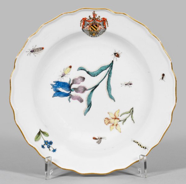 Passiger, fassonierter Goldrand. Im Spiegel und auf der Fahne große ombrierte Holzschnittblumen umgeben von Käfern, Raupen und weiteren Insekten. Auf Anstieg und Fahne farbiges Wappen von Carlo Francesco Vincenzo Ferrero Marchese d'Ormea (1680 - 1745), Großkanzler des Königreichs von Sardinien unter Karl Emanuel I., König von Sardinien-Piemont und als Karl Emanuel III. Herzog von Savoyen. Polychrome Malerei. Schwertermarke. D. 23,5 cm.