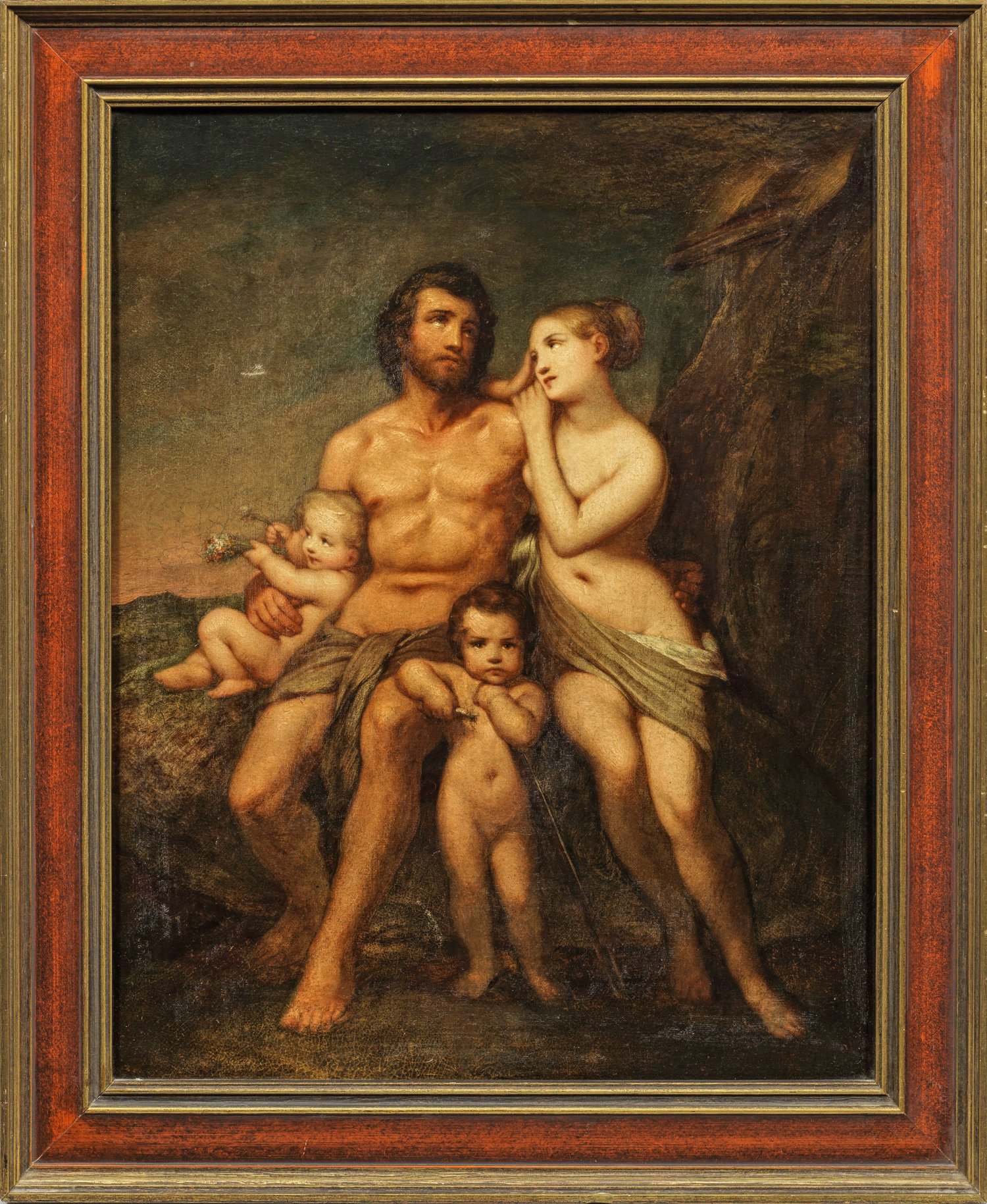 Szene aus der griechischen Mythologie mit der in Zeus verliebten Hera, die inzestuös zugleich dessen Schwester und Gemahlin ist. Öl/Lwd., doubl.; Ger. Läsur. 45 cm x 35,5 cm. Rahmen.