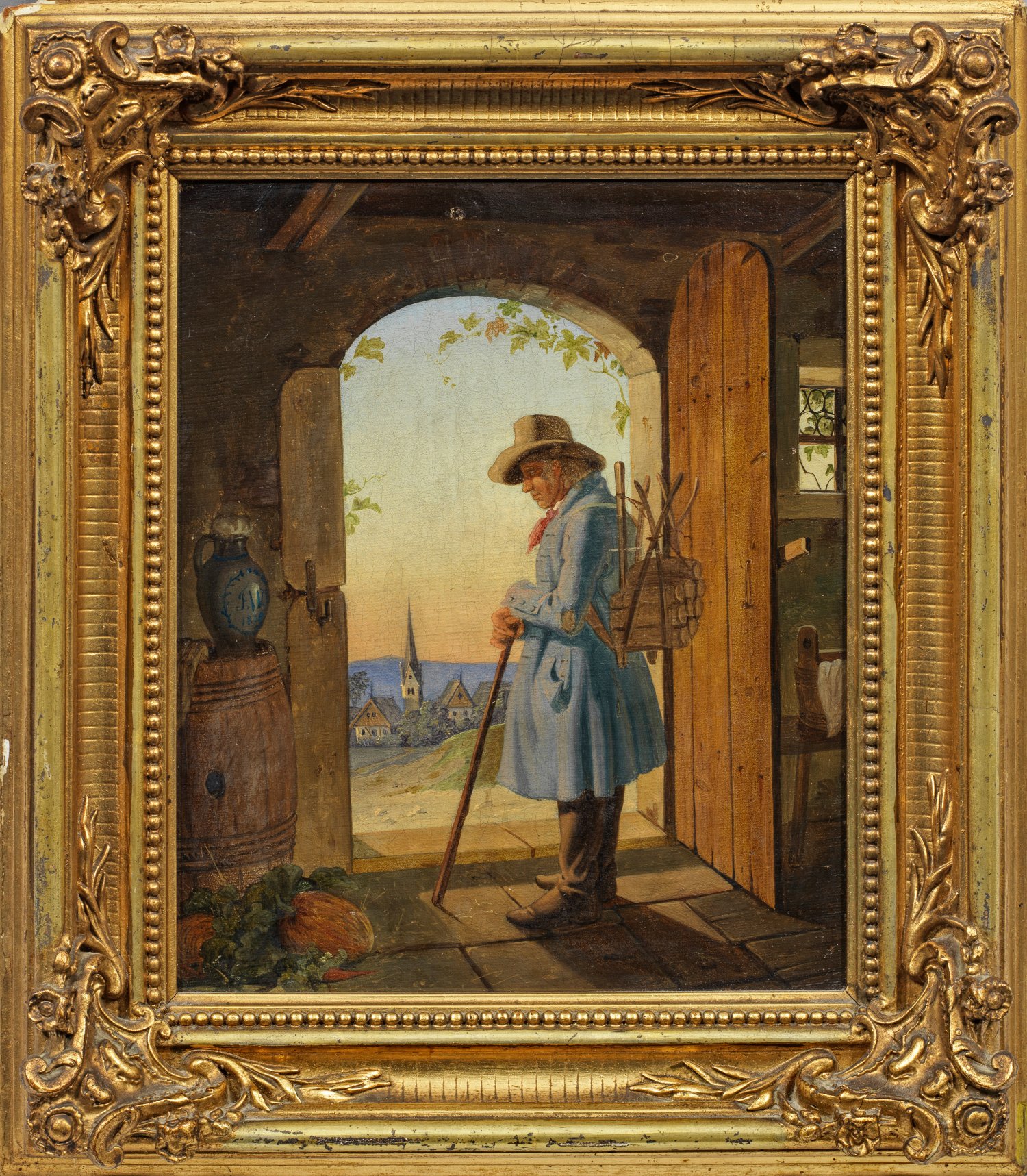In fein lasierender Malerei ausgeführtes Genrebild vor einer morgendlich gestimmten Landschaft mit Blick auf ein Dorf mit Kirche. Am linken Bildrand auf einem Steinzeugkrug monogr. u. dat. 1838. Öl/Lwd.; 24,5 cm x 21 cm. Wohl Original-Rahmen.
