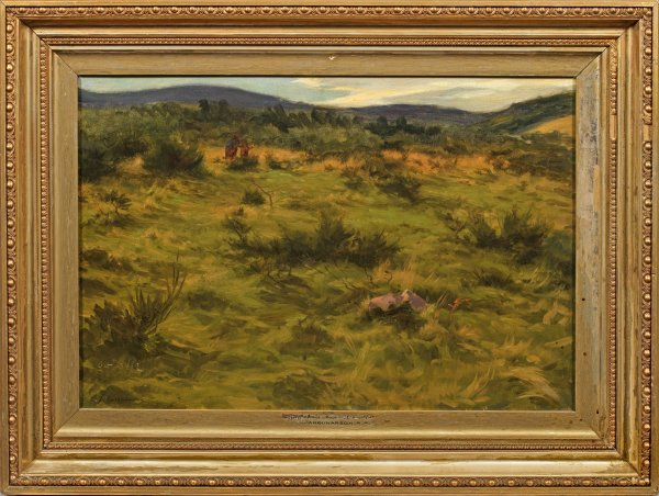Stimmungsvolle, subtil kolorierte Moorimpression des schottischen Malers, der Schüler von Peter Graham war. Farquharson wurde besonders für seine effektvollen Stimmungslandschaften geschätzt, die er mit Vorliebe direkt in der Natur bei poetischem Morgen- oder Abendlicht einfing. Öl/Lwd. (Malwarenstempel von Winsor & Newton, London); L. u. sign.; dat. "Oct. 13 / (18)92". Auf dem Rahmen handschriftlich bez. mit Ortsangabe; 51 cm x 76,3 cm. Rahmen.