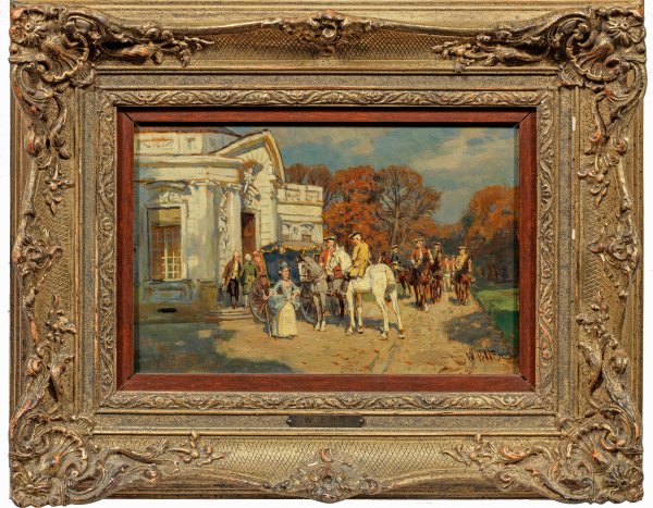 Fein gemaltes, in der impressiven Stimmung, im subtil ausgeführten Kolorit und Motiv typisches Werk des an der Münchener Akademie bei Wilhelm Diez ausgebildeten Künstlers. Velten malte mehrfach Jagdgesellschaften vor der Kulisse berühmter Schlösser, in denen er seine Begabung als subtiler Kolorist zum Ausdruck bringen konnte. Öl/Holztafel. R. u. sign.; 16 cm x 24 cm. Rahmen.