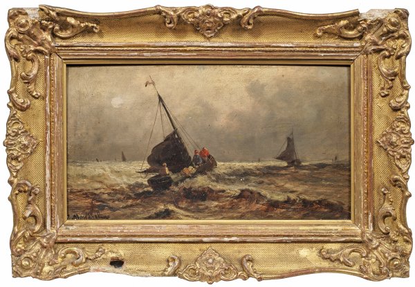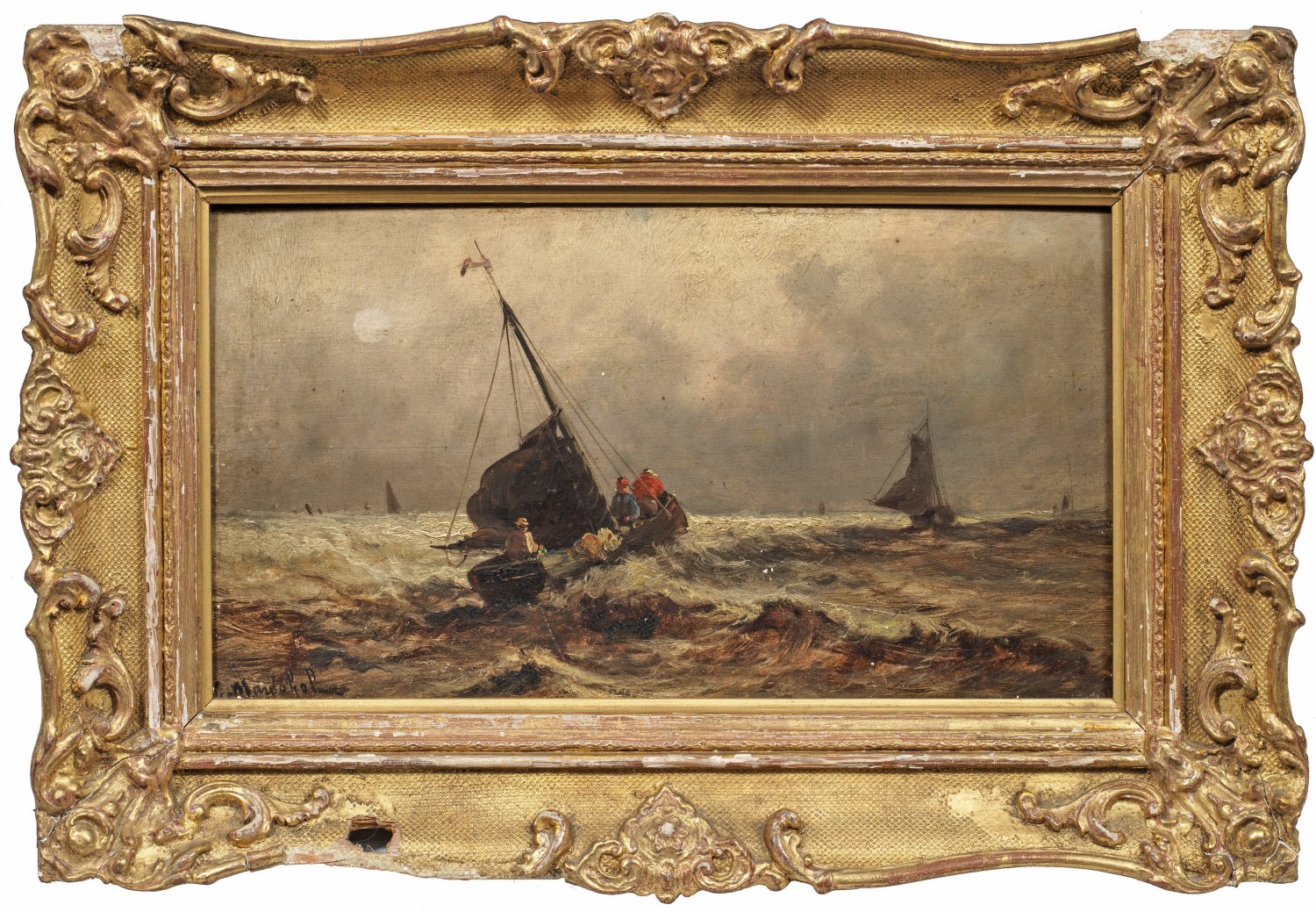 Durch eine lichte Wolkendecke fällt der Schein des Mondes und erleuchtet die schäumenden Meereswogen, auf denen zahlreiche Segler unterwegs sind. Öl/Holztafel. L. u. sign. "C. Mandehof" (?). 21,5 cm x 41 cm. Rahmen.