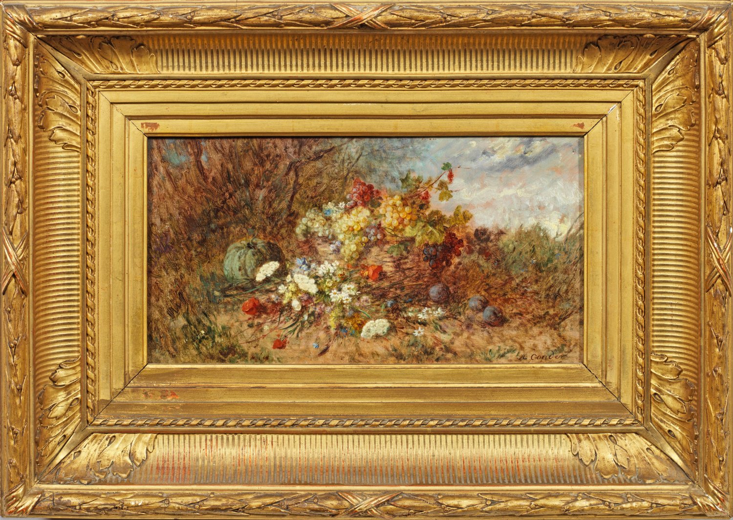 In impressionistischer, duftig lockerer Manier gemaltes Stillleben mit Trauben, Pflaumen, Kürbis und bunten Sommerblühern, arrangiert in einem Weidenkorb vor Landschaftsstaffage. Öl/Mahagonitafel. R. u. sign.; 19 cm x 36 cm. Rahmen.