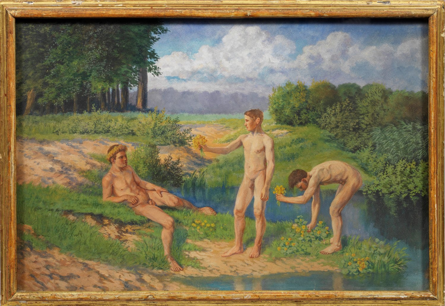 Unter duftig bewölktem Himmel, in sommerlich grünender, lebendig kolorierter Landschaft vergnügen sich drei junge Männer, die am Ufer des Sees wachsenden, gelb blühenden Blumen pflückend. Reizvolle, erotische Impression im Zeitgeschmack der Jahrhundertwende. Gouache/Papier, kaschiert auf Karton. 37 cm x 55,7 cm. Rahmen.