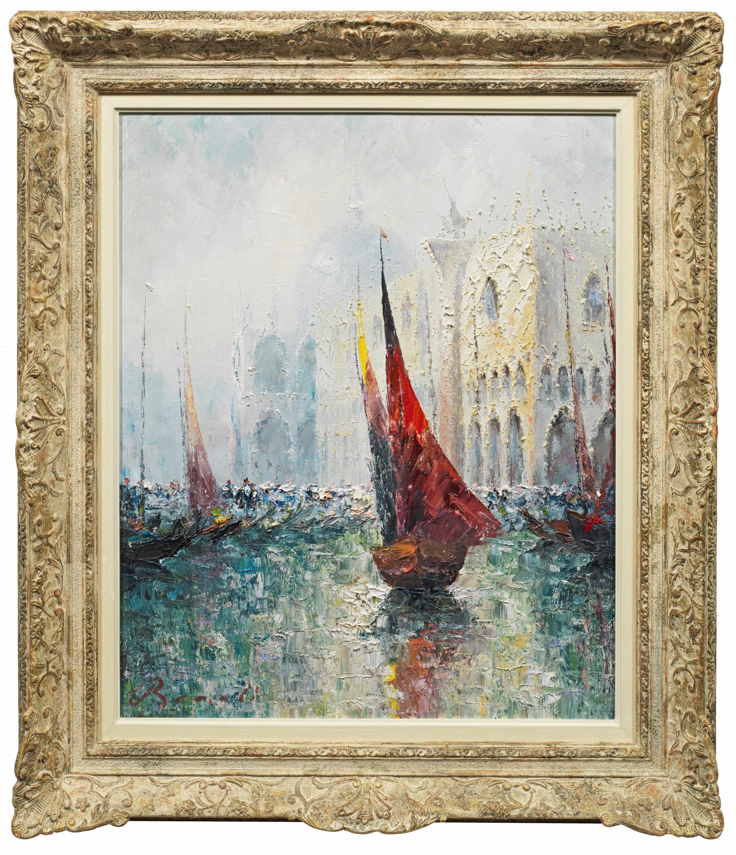 In impressionistischer Auffassung und äußerst pastosem Farbauftrag komponierte Vedute mit Segelschiffen vor dem Dogenpalast in Venedig. Öl/Lwd.; L. u. sign. mit Pseudonym "Benali"; Verso Galerieetikett des Kunsthauses Bühler, Stuttgart. 60 cm x 50 cm. Rahmen.