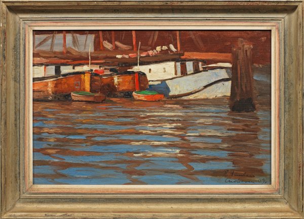 In leuchtenden Farben und dynamischem Duktus angelegte, ausschnitthafte Komposition Hüntens, der an den Akademien in Karlsruhe bei Gustav Schönleber und in Berlin studierte sowie im Atelier von Hans Fredrik Gude lernte. Öl/Lwd., kaschiert auf Karton. R. u. sign., mit Ortsangabe Cuxhaven und dat. (19)09. Ca. 37 cm x 58 cm. Rahmen.