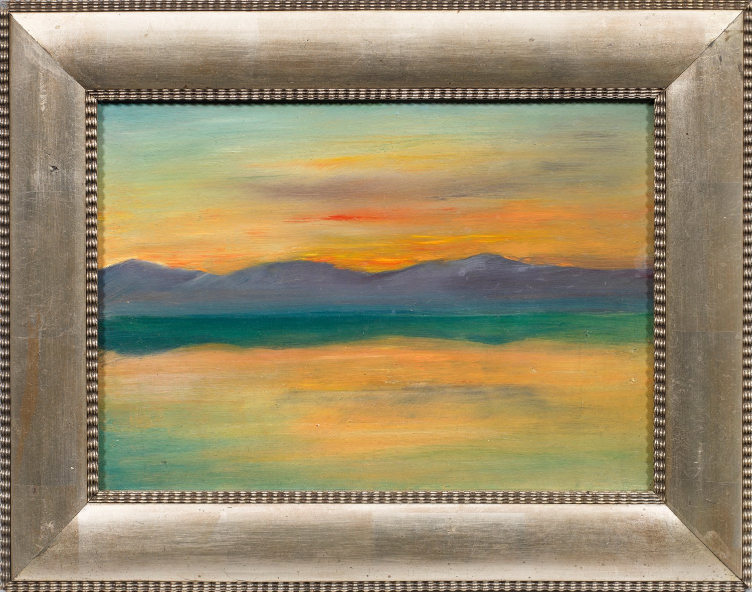 Farbintensive, flächig komponierte, sich der Abstraktion nähernde Landschaft, wohl von der griechischen Küste. Ballenberger studierte ab 1884 an der Münchener Akademie und war dort nach seinem Studium als freier Maler tätig. Öl/Malkarton. 25,5 cm x 36 cm. Verso Nachlass-Stempel. Rahmen.