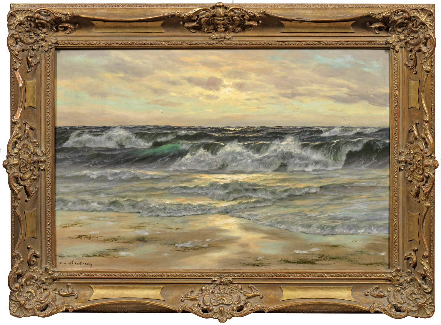 Charakteristisches Werk des bekannten Marinemalers, der in Düsseldorf und Berlin tätig war. Bekannt machten ihn besonders seine atmosphärischen Schilderungen der Nordsee, sowohl der gischtigen, teilw. vom Sturm bewegten Wellen auf hoher See als auch in der Uferzone. Öl/Lwd.; R. u. sign.; 60,5 cm x 90,5 cm. Rahmen.