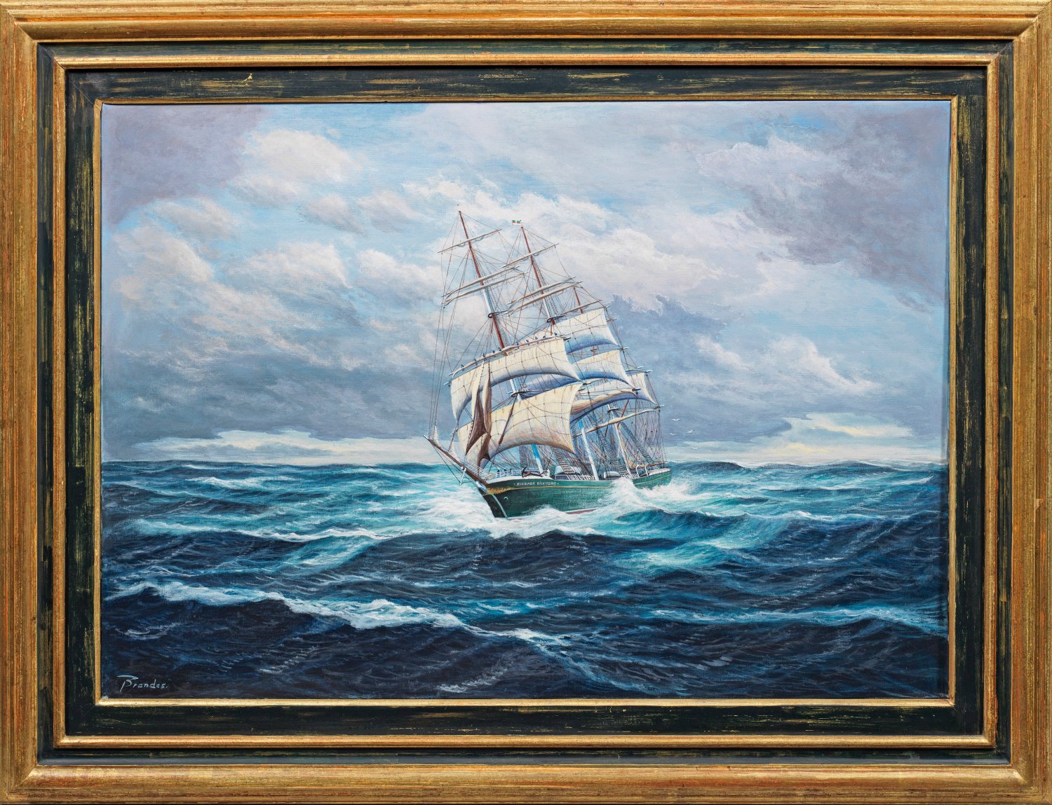 Stimmungsvolle Darstellung des 1896 als Vollschiff vom Stapel gelaufenen Dreimasters (seit 1904 Takelung als Bark), welches seit 1983 als Museums- und Denkmalschiff sowie schwimmendes Wahrzeichen Hamburgs im Hafen bei den St. Pauli-Landungsbrücken liegt. Öl/Lwd.; L. u. sign.; 70 cm x 100 cm. Rahmen.