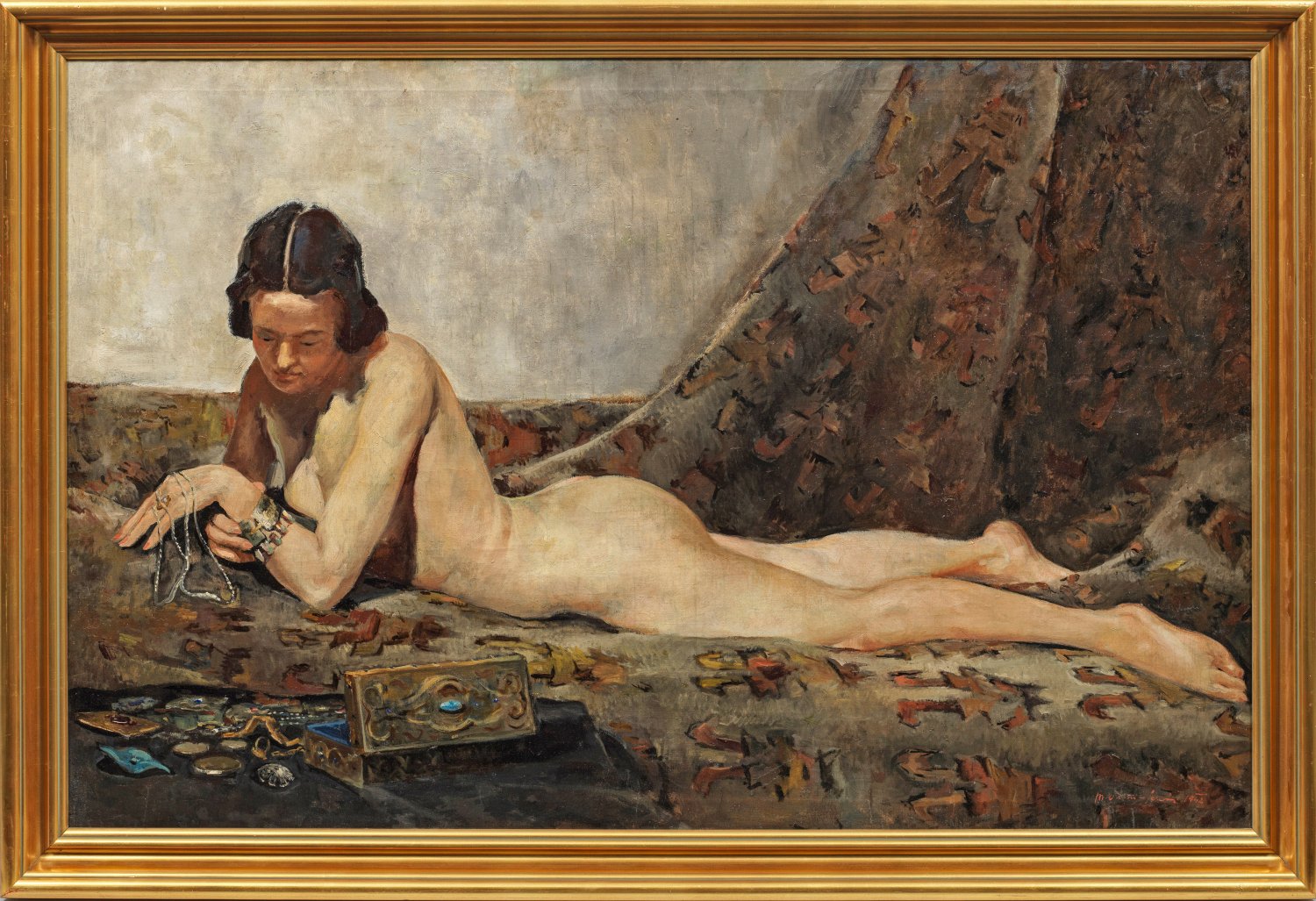 Auf einem Diwan liegender weiblicher Akt beim Betrachten von Geschmeide aus einer geöffneten Schmuckschatulle. Großformatige, mit weich-pastosem Farbauftrag und in subtil abgestuftem, dezentem Kolorit ausgeführte, dekorative Aktdarstellung. Öl/Lwd. ; R. u. undeutl. sign. u. dat. 1942. Verso Etikett "Einrahmungswerkstätte u. Kunsthandlung Franz Weisz (/) Wien III, Erdbergstraße 25". Ger. Läsuren. 85,5 x 132,5 cm. Rahmen.