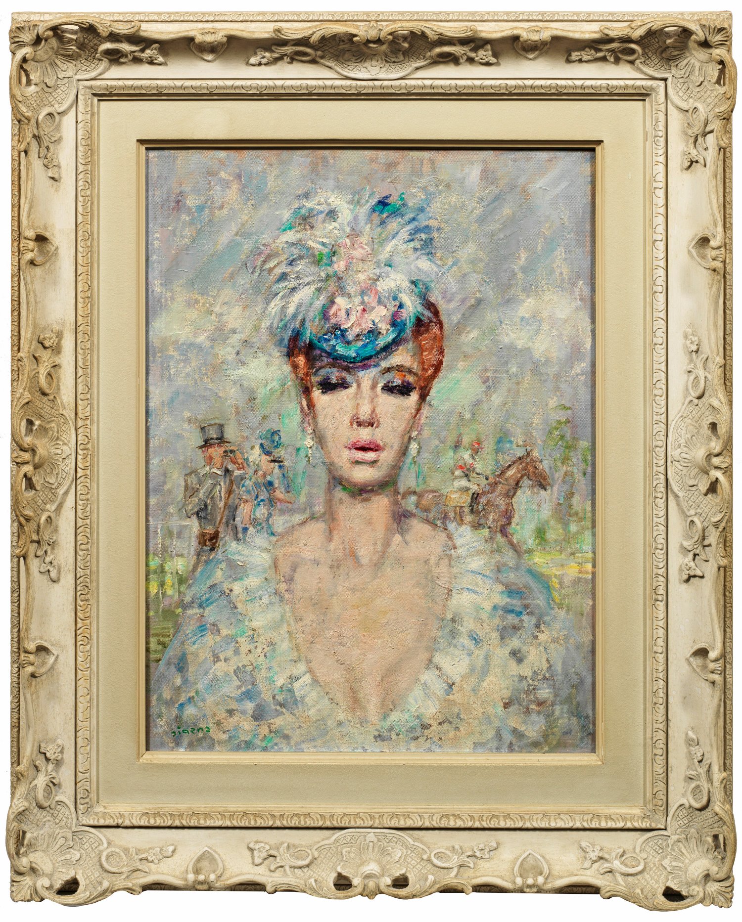 In hellem, pastelltonigem Kolorit und mit pastosem Farbauftrag ausgeführtes Bildnis en face, inspiriert durch den Impressionismus und Jean-Gabriel Domergue. ÖL/Lwd.; L. u. undeutl. sign.; 64 cm x 48 cm. Rahmen.