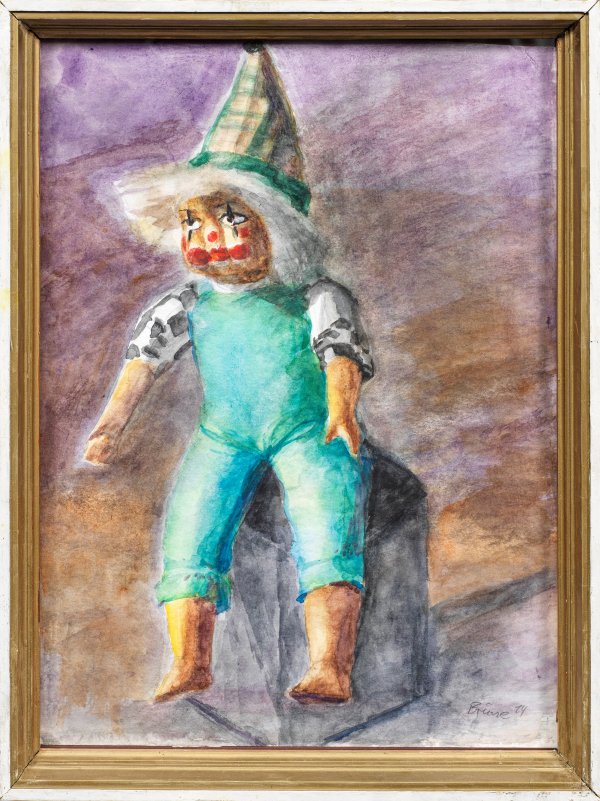 Auf einem Kubus vor neutralem Hintergrund sitzt eine Puppe als Clown inszeniert. Sujet- und stiltypisches Werk Brünes, deren Oeuvre von Menschen- und Puppenmotiven geprägt ist. Die Künstlerin studierte 1961-1966 an der Hochschule für Grafik und Buchkunst in Leipzig und ließ sich anschließend freischaffend in Leipzig nieder. 1979-1999 war sie als Dozentin der Mal- und Grafikklasse an der Hochschule Burg Giebichenstein tätig. Aquarell/Papier. R. u. sign. und dat. (20)14. Ca. 39,3 cm x 29,5 cm. Rahmen.