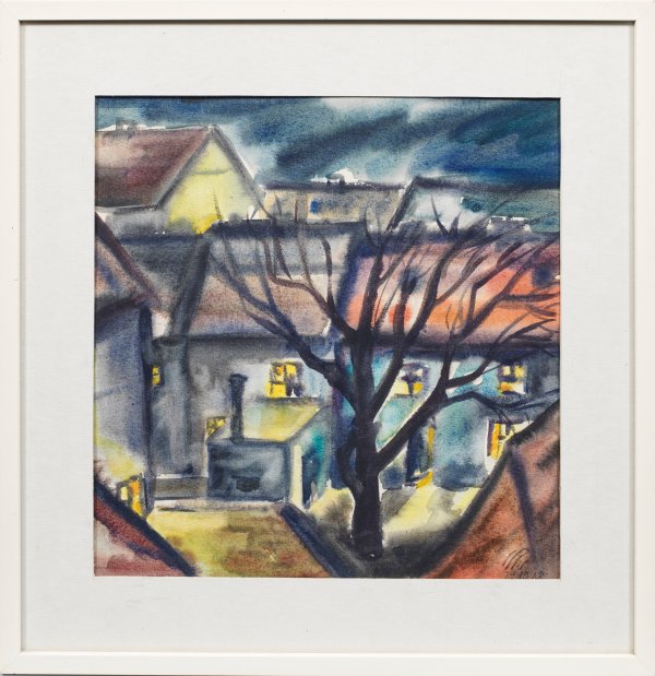 In expressivem Kolorit komponierte, nächtliche Dorfansicht mit hell erleuchteten Fenstern. In Motiv und Stil charakteristisches Blatt Querners, der ab 1926 an der Akademie in Dresden bei Richard Müller, Georg Lührig und Otto Dix studierte. Seine Motive, die er überwiegend zeichnerisch und als Aquarelle umsetzte, fand er in seiner Heimat - Landschaften aus dem Vorerzgebirge, dörfliche Motive seines Heimatortes Börnchen und städtische Motive aus den ärmlichen Vororten von Dresden. Aquarell/Papier. R. u. monogr. und dat. 29.10.(19)68 (?). Passepartoutausschnitt 33,6 cm x 32,8 cm. Rahmen.