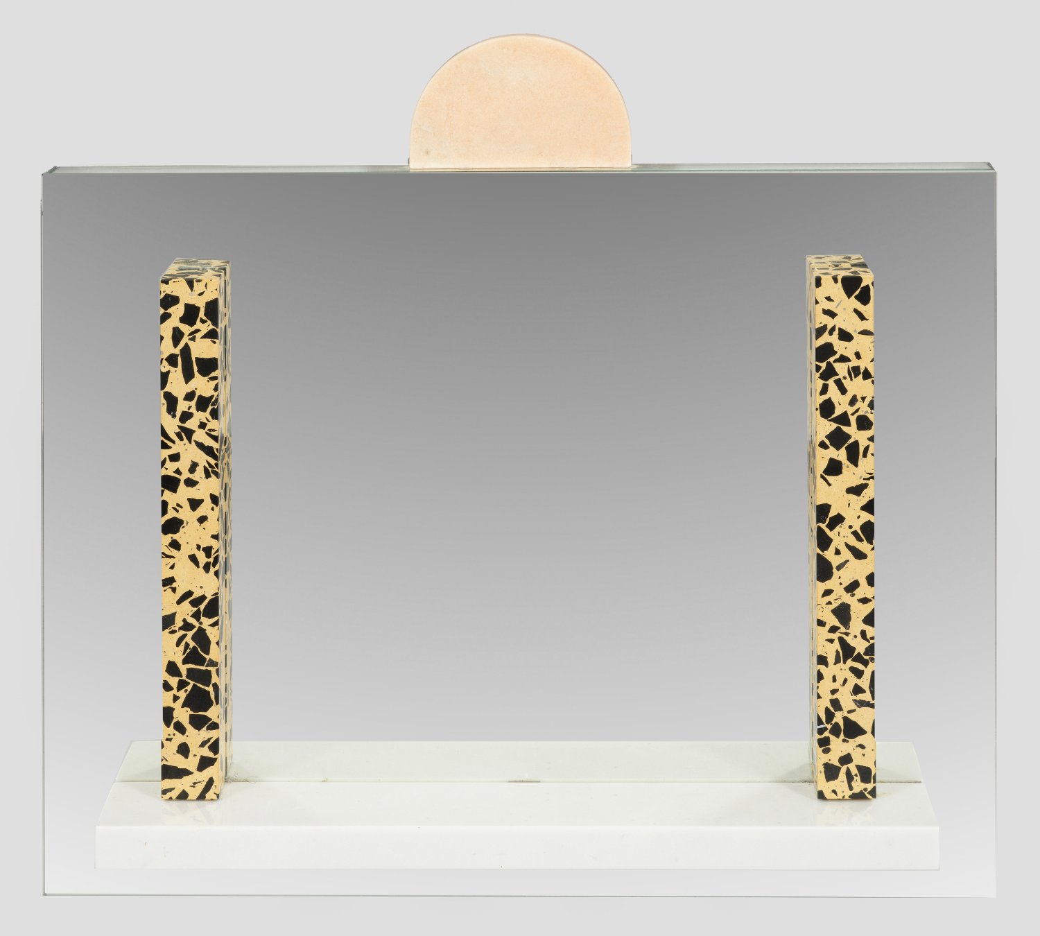 Weißer und roséfarbener Marmor sowie gelb-schwarz gemaserter Terrazzo und Spiegelglas. Querrechteckig angelegte Spiegelfläche mit Segmentbekrönung. Vorgelagerte Abstellfläche sowie vertikal angeordnete Pilaster. Unbez.; Entw. Ettore Sottsass. 62 cm x 68 cm.