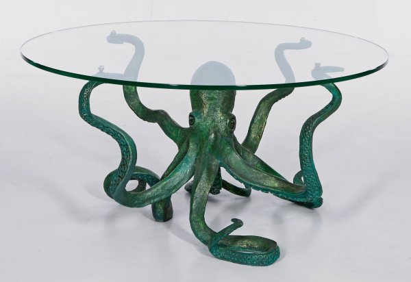 Messing, gegossen und grün patiniert sowie farbloses Glas. Korpus in Gestalt eines großen, naturalistisch gestalteten Oktopus. Kopf und Arme mit flächendeckend ausgearbeiteten Saugnäpfen des Kraken dienen als Träger für die runde Deckplatte. Herstellerzeichen "Marie Martin by Pieter Adam". H. 52 cm. D. 100 cm.