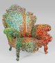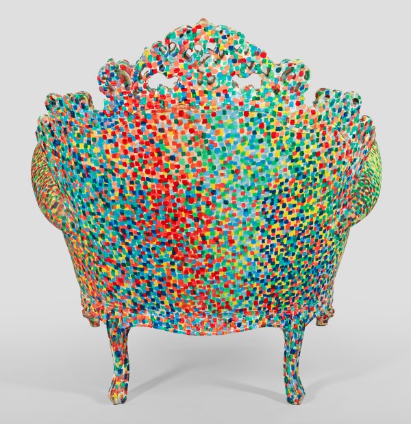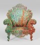 Buchenholz, geschnitzt und weiß gefasst sowie weißer Baumwollstoff, insgesamt flächendeckend polychrom mit Acrylfarbe handbemalt. Passig geschweifte, durchbrochen gearbeitete Zarge sowie weit ausladende Armlehnen aus üppigen Voluten. Gebogte, hochaufgeworfene Rückenlehnenrahmung. Allseitig gepolstert und bezogen. Entw. Alessandro Mendini, 1978. Unw. besch.; H. 109 cm. 103 cm x 90 cm. Sitz-H.35 cm.