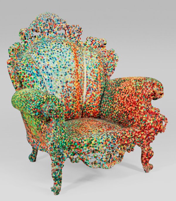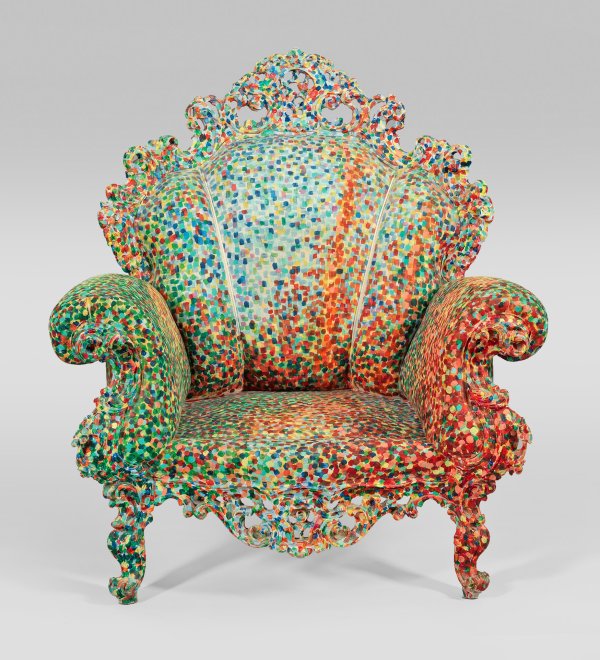 Der 1978 von Alessandro Mendini (1931-2019) entworfene Proust-Sessel bildet den Start einer Reihe sog. Re-Designs, die Form und Dekor bereits vorhandener Entwürfe neu interpretierten. Als Vorbild des Sessels dient ein neobarockes Möbel aus dem Umfeld Marcel Prousts, auf das Mendini im Rahmen der Entwicklung eines Stoffentwurfs für Cassina stieß. In seinem Dekor bezieht sich das Möbel auf ein pointillistisches Gemälde Paul Signacs. So gelingt es Mendini "nicht nur den Impressionismus, sondern zugleich das Barock mit seinem zentralen Motiv der Unendlichkeit zu zitieren". Mit dem zunächst als Einzelstück gedachten, dann aber als Unikat bzw. in Kleinstserie gefertigten Entwurf, bricht Mendini mit den klassischen Design-Qualitäten wie originäre Gestaltung, funktionaler Aufbau oder ökonomischer Produktion. Das vorliegende Möbel mit seinem handgetupften Dekor ist eine der frühesten Ausführungen.