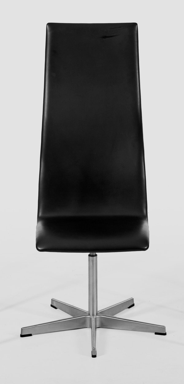Aluminium und schwarzes Leder. Über sternförmigem Fuß zylinderförmiger Schaft als Träger für drehbare Sitzfläche mit hoher, rechteckiger und leicht zurückschwingender Rückenlehne. Herstellerzeichen. Entw. Arne Jacobsen, 1965. Sitz-H. 46 cm.